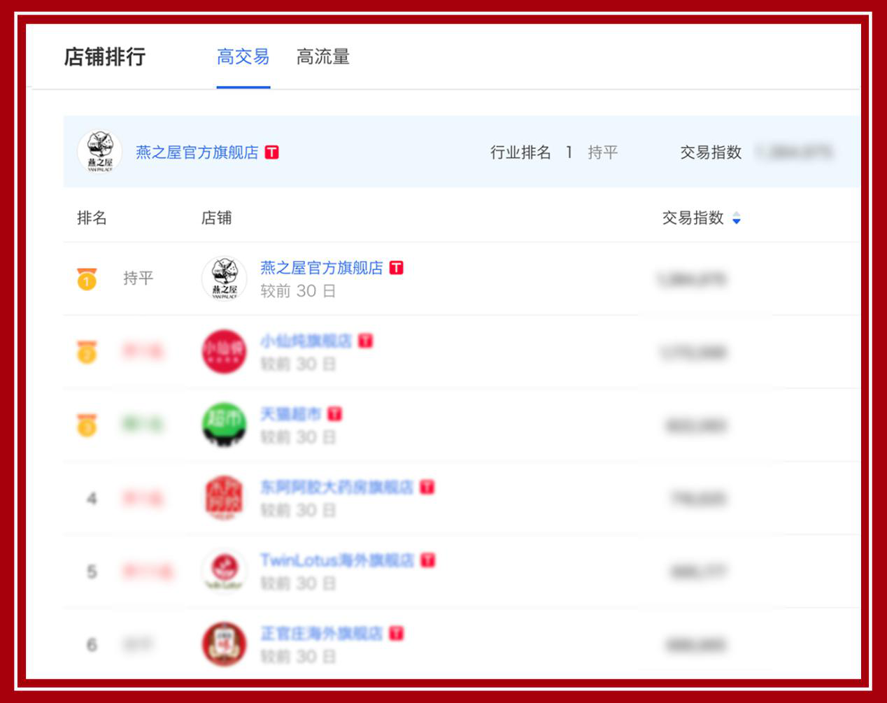 據阿里巴巴生意參謀數據顯示,2019年6月1日00:00至6月18日23:59,燕之屋天貓成交總額突破4000萬(wàn),同比實(shí)現100%以上的增長(cháng)。在天貓傳統滋補營(yíng)養品(燕窩滋補品包括:干燕窩、即食燕窩、燕窩制品)類(lèi)目中,憑借亮眼的數據表現,再度登上行業(yè)銷(xiāo)量第一的寶座。